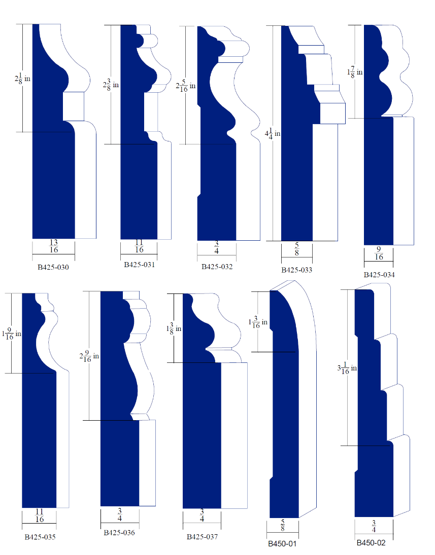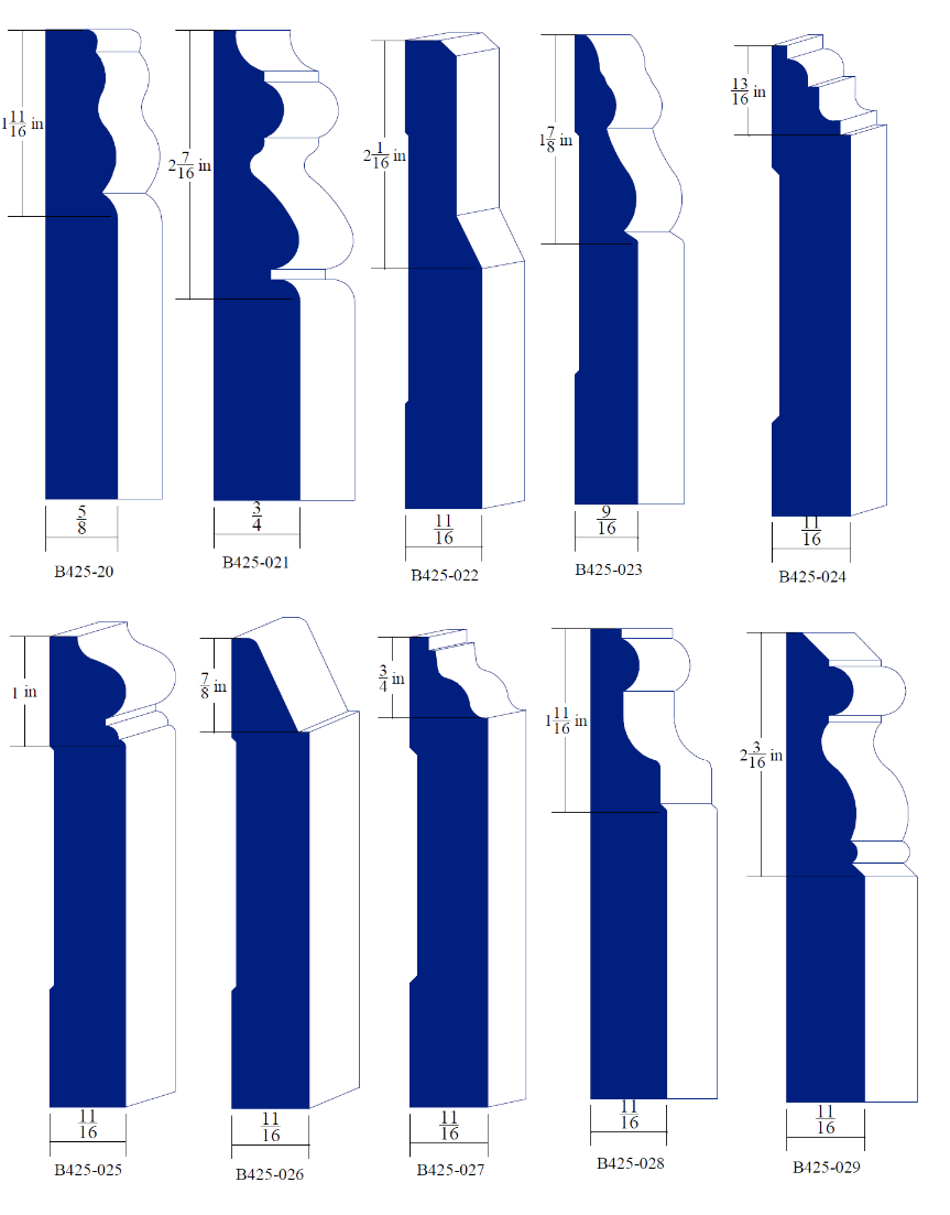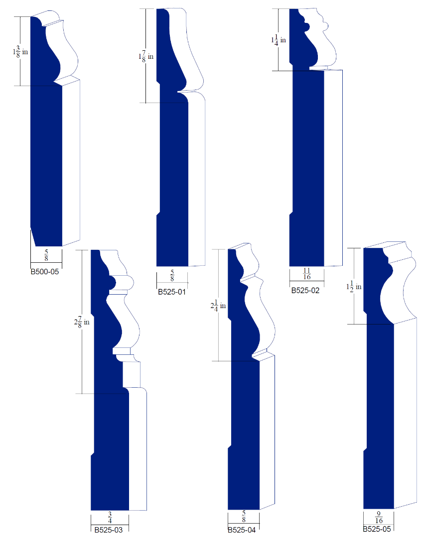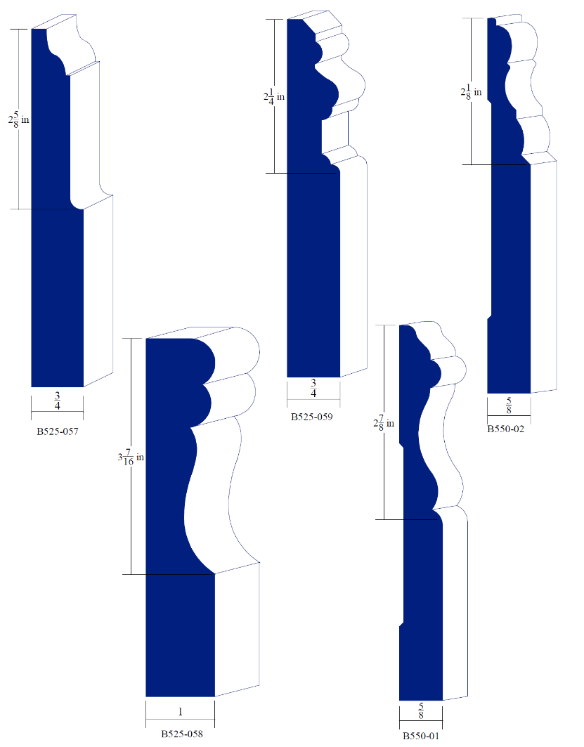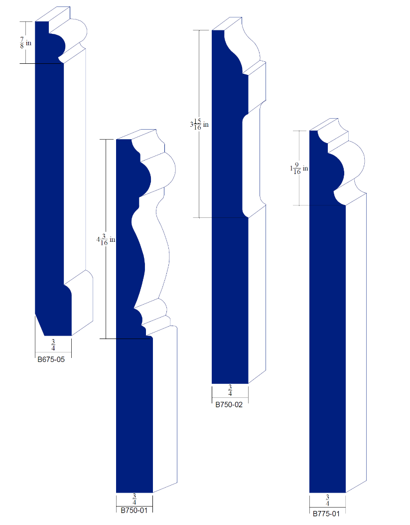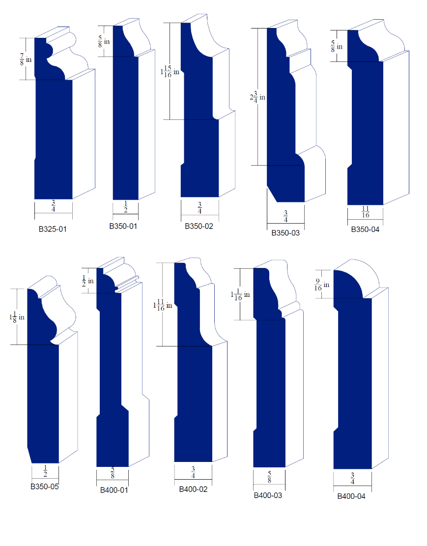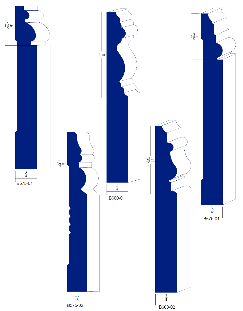 Please Note: Height dimension of baseboards is not shown, but can be determined by the profile number after the letter "B". For Example, Baseboard B425-01 would have a height of 4 1/4". And Baseboard B350-02 would have a height of 3 1/2"