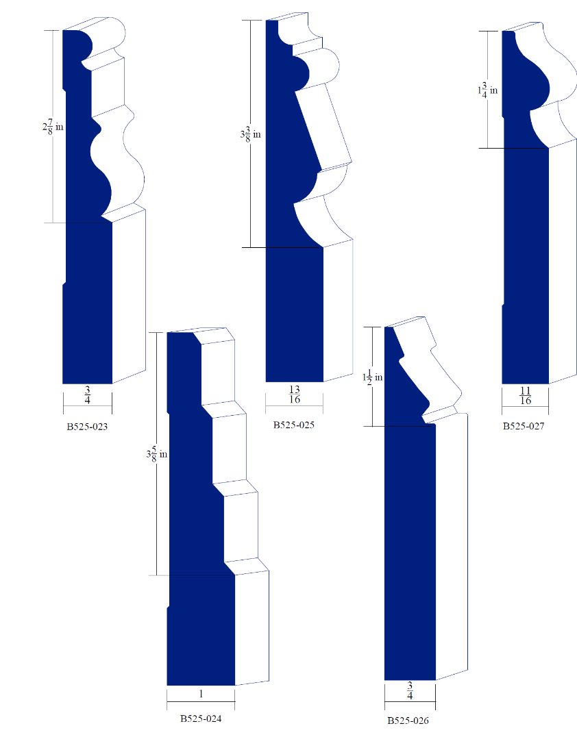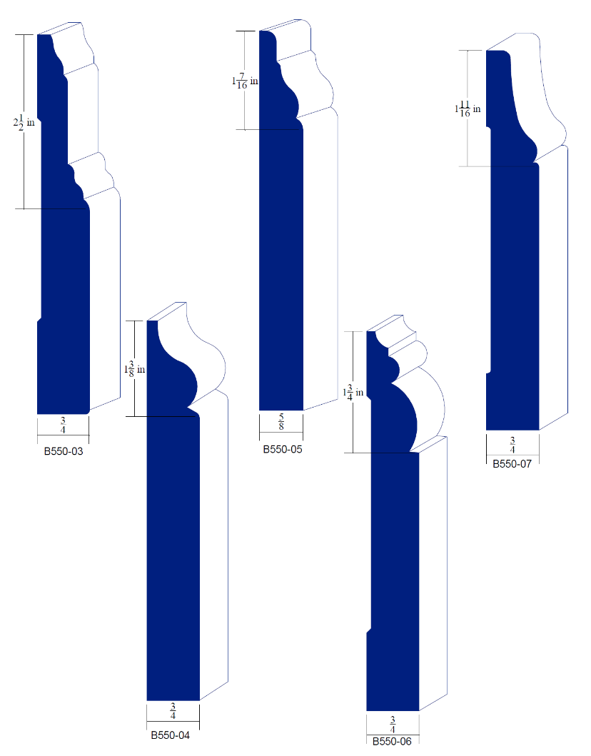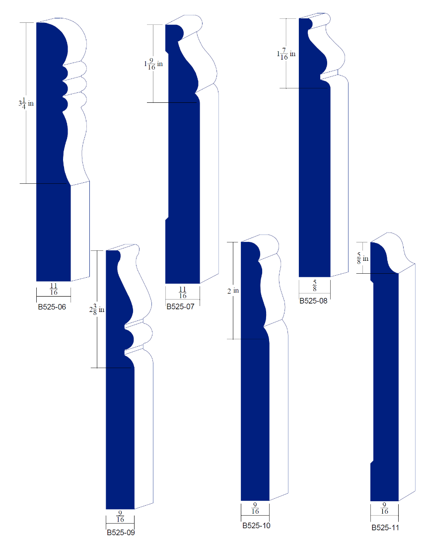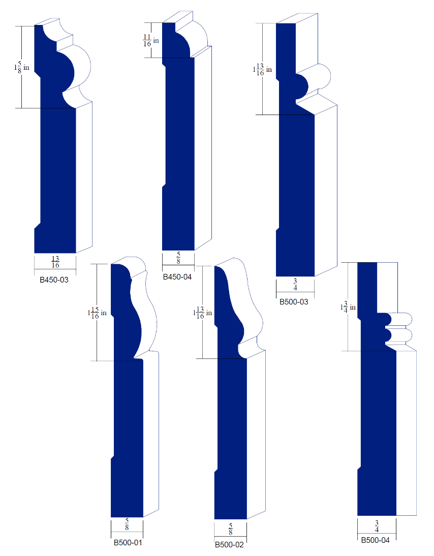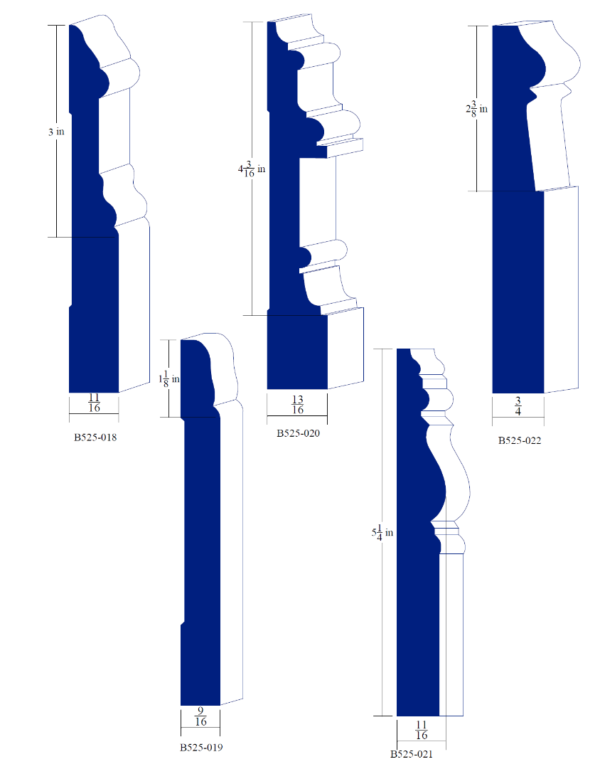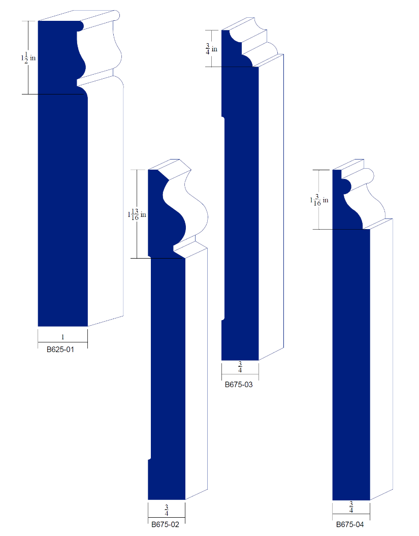 Please Note: Height dimension of baseboards is not shown, but can be determined by the profile number after the letter "B". For Example, Baseboard B425-01 would have a height of 4 1/4". And Baseboard B350-02 would have a height of 3 1/2"