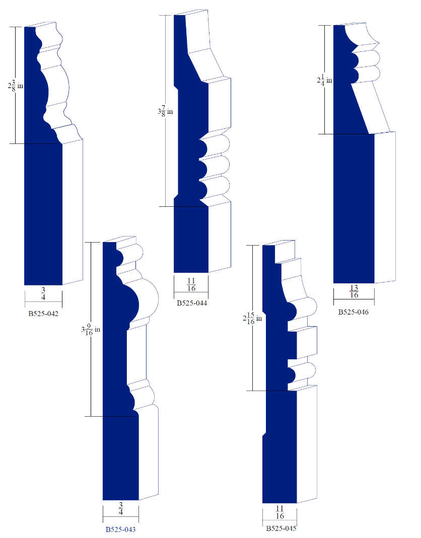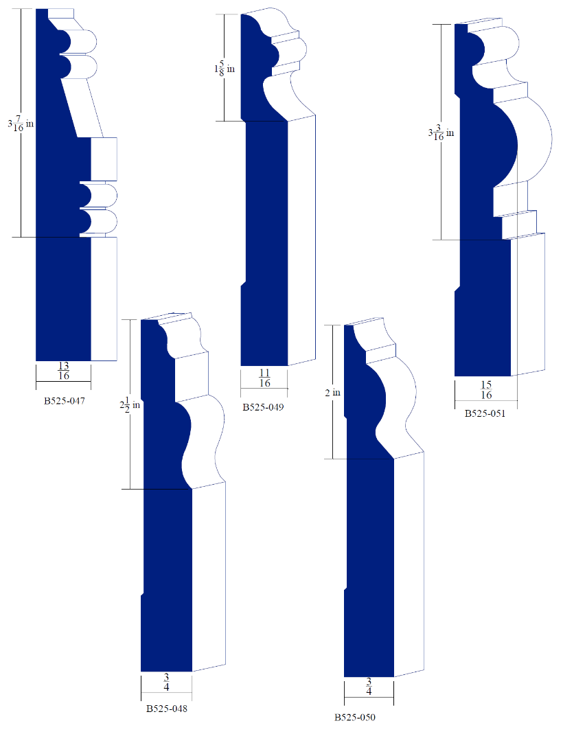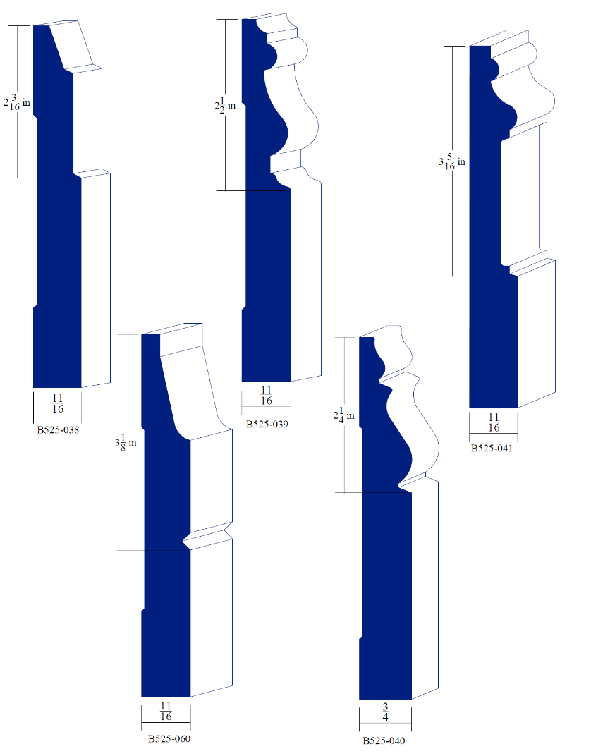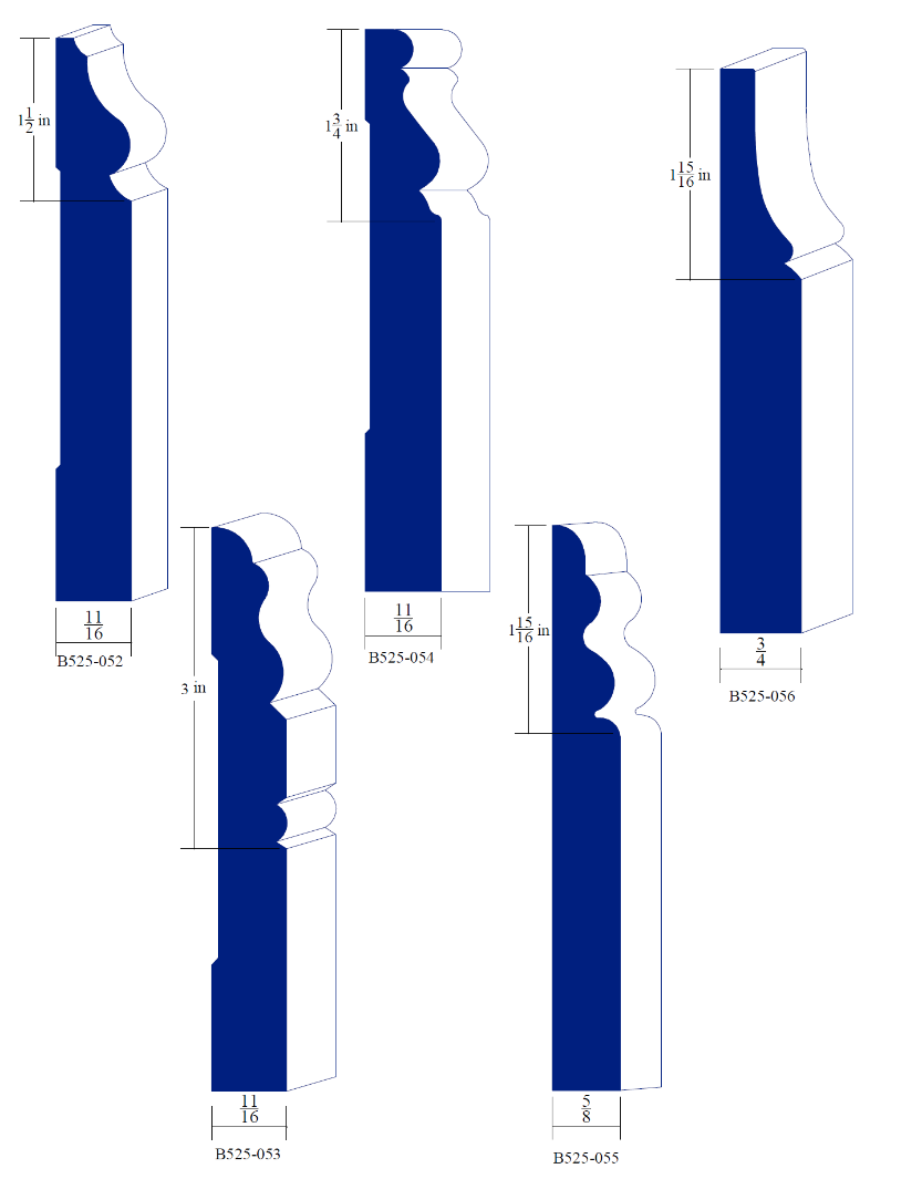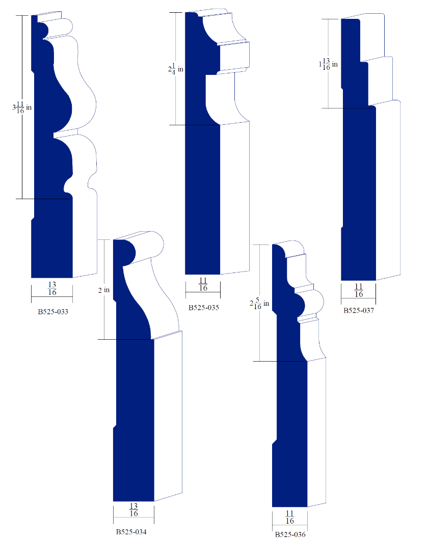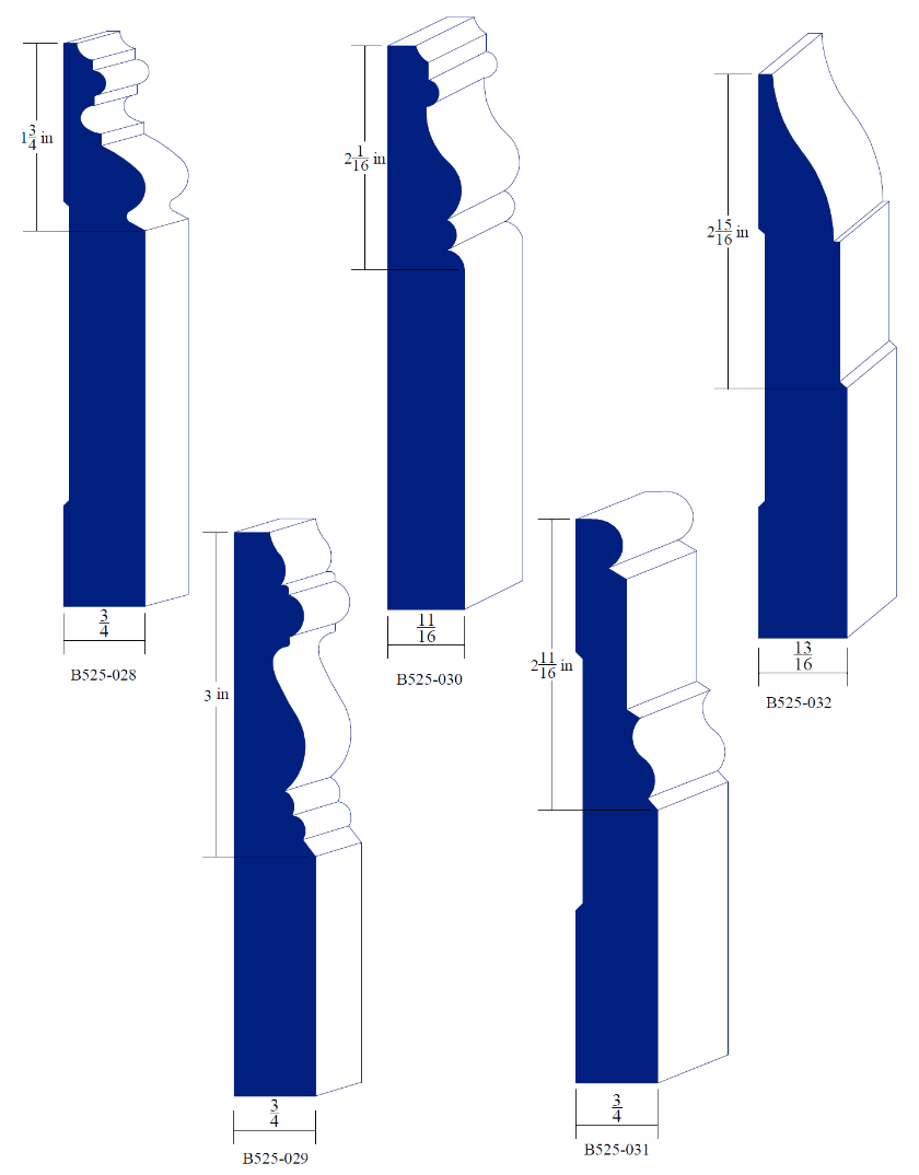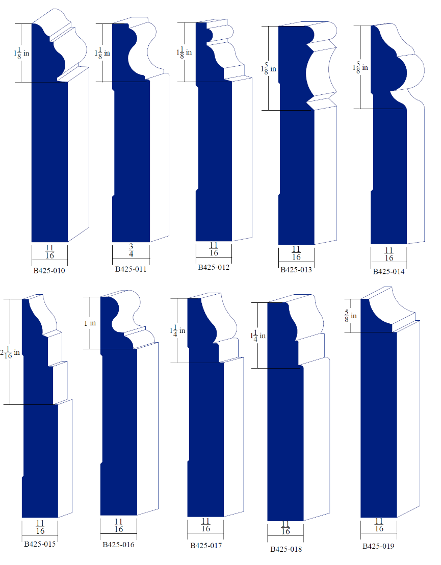 Please Note: Height dimension of baseboards is not shown, but can be determined by the profile number after the letter "B". For Example, Baseboard B425-01 would have a height of 4 1/4". And Baseboard B350-02 would have a height of 3 1/2"